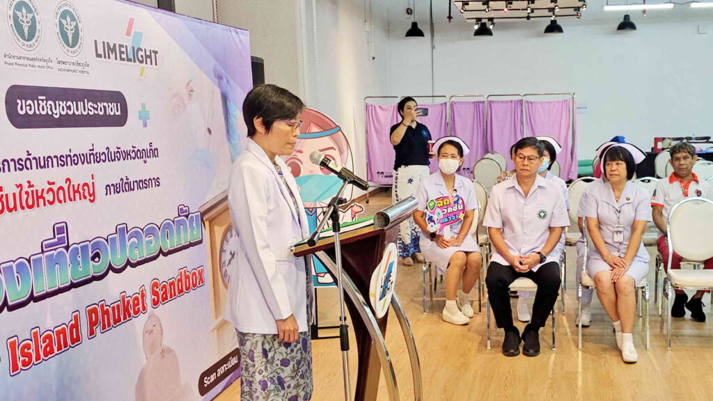 เมื่อวันที่ 13 พฤศจิกายน 2566 บริเวณชั้น 2 ไลม์ไลท์ ภูเก็ต นายแพทย์กู้ศักดิ์ กู้เกียรติกูล นายแพทย์สาธารณสุขจังหวัดภูเก็ต ให้เกียรติ เปิดมาตรการ “นักท่องเที่ยวปลอดภัย : Safety Phuket Island Sandbox” เพื่อสร้างความเชื่อมั่นด้านความปลอดภัยในพื้นที่ท่องเที่ยว โดยให้บริการฉีดวัคซีนไข้หวัดใหญ่ให้กับผู้ให้บริการนักท่องเที่ยวในพื้นที่ จ.ภูเก็ต โดยมี พร้อมแพทย์หญิงปิยนาถ สกุลพิพัฒน์ รองผู้อำนวยการโรงพยาบาลวชิระภูเก็ต, นางสาวอังคณา ธเนศวิเศษกุล รองประธานมูลนิธิพัฒนาการท่องเที่ยวยั่งยืน และผู้เกี่ยวข้องร่วมสังเกตการณ์