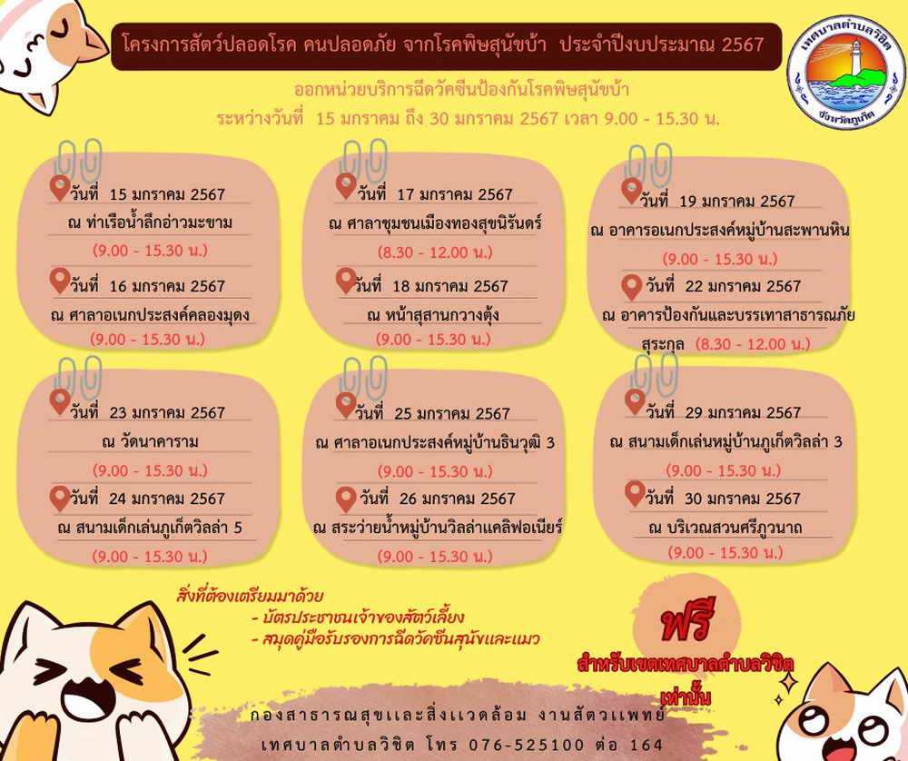 ด้วยทางเทศบาลตำบลวิชิต ได้จัดโครงการสัตว์ปลอดโรค คนปลอดภัย จากโรคพิษสุนัขบ้า ประจำปีงบประมาณ 2567 จึงได้จัดกิจกรรมออกหน่วยบริการฉีดวัคซีนให้กับสุนัข และแมว เพื่อป้องกันโรคพิษสุนัขบ้า ระหว่างวันที่ 15 – 30 มกราคม 2567 ตั้งแต่เวลา 09.00 – 15.30 น. โดยไม่ต้องเสียค่าใช้จ่ายแต่อย่างใด