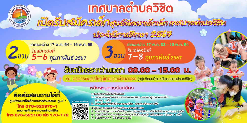 หรือติดต่อสอบถามเพิ่มเติมได้ที่ ศูนย์พัฒนาเด็กเล็กเทศบาลตำบลวิชิต ศูนย์ 1 โทร.076-525970-1 หรือที่กองการศึกษาเทศบาลตำบลวิชิต โทร.076-525100 ต่อ 170-172 (ในวันและเวลาราชการ)