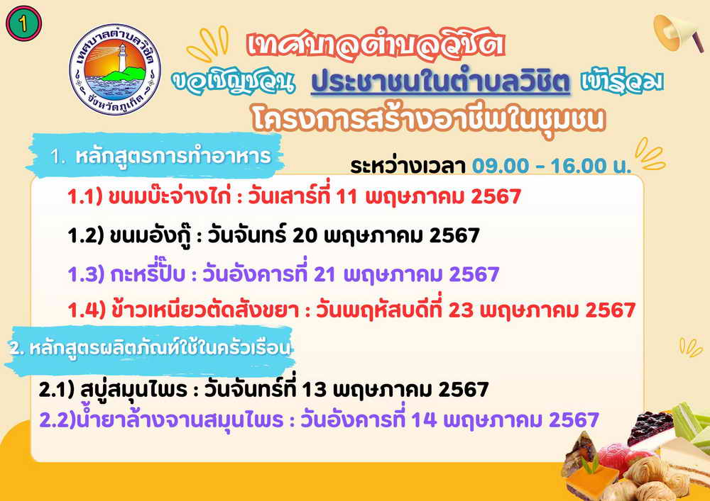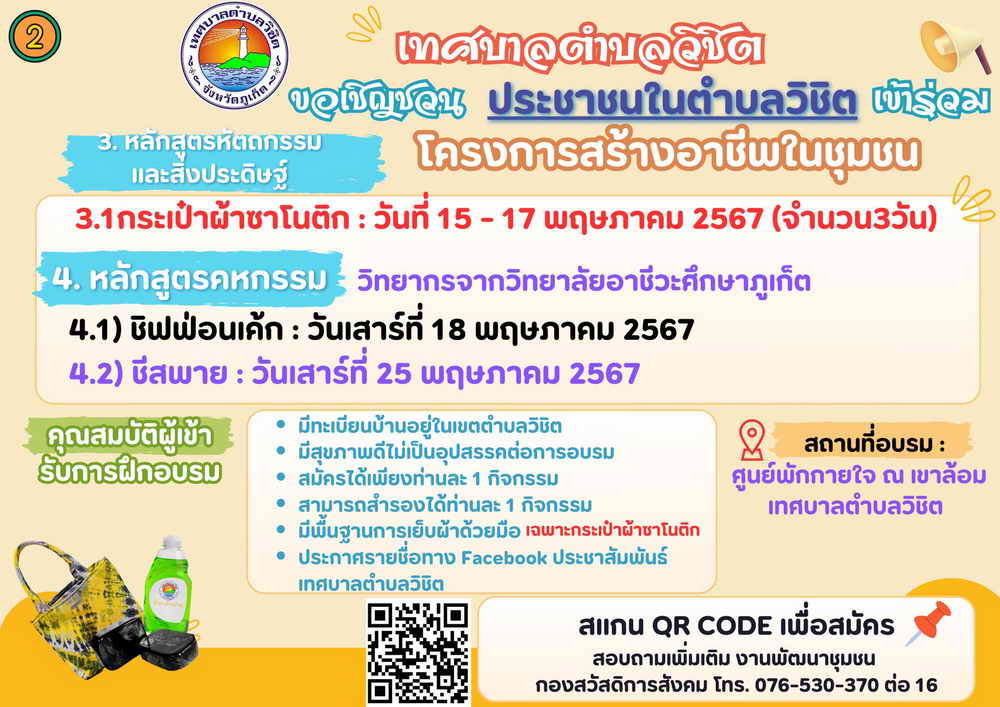 ด้วยทาง กองสวัสดิการสังคม เทศบาลตำบลวิชิต ขอเชิญชวนประชาชนในตำบลวิชิต เข้าร่วมโครงการสร้างอาชีพในชุมชน ประจำปี 2567
