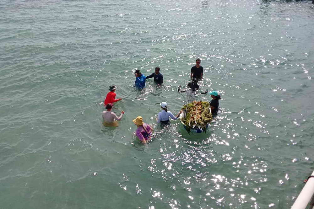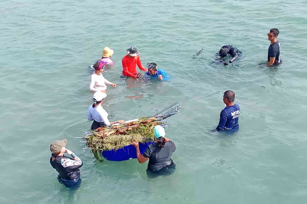 จากนั้นจึงได้ติดตั้งแปลงเสริมอาหาร ชนิดสาหร่ายผมนางและผักบุ้ง อย่างละ 2 แปลง รวม 4 แปลง โดยพบเต่าตนุ วัยเด็ก จำนวน 1 ตัว ความสมบูรณ์ของร่างกายระดับสมบูรณ์ดี ( BCS =3/5) พบพะยูนจำนวน 4 ตัว จากการประเมินสุขภาพ พะยูนมีความสมบูรณ์ของร่างกายระดับสมบูรณ์ดี ( BCS =3/5) อัตราการหายใจ 3-5 ครั้งใน 5 นาที ทั้ง 4 ตัว พบพะยูนจำนวน 1 ตัว มีรอยถลอกและรอยเขี้ยวจากพฤติกรรมฝูงบริเวณด้านข้างขวาของลำตัว ซึ่งเจ้าหน้าที่ได้ทำการติดตามเฝ้าระวัง เพื่อควบคุมป้องกัน กิจกรรมที่จะทำให้เกิดความเสี่ยงและผลกระทบต่อพะยูนต่อไป