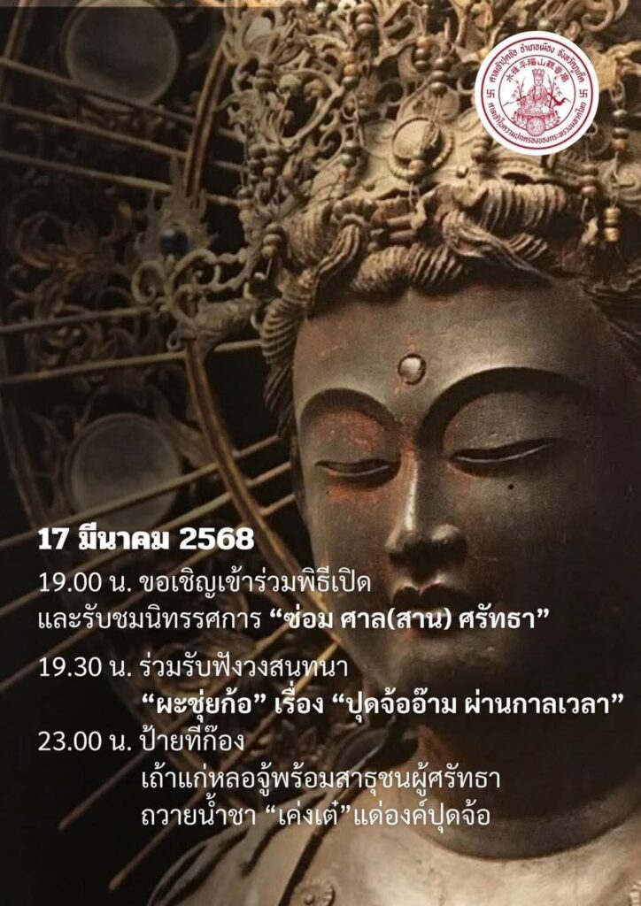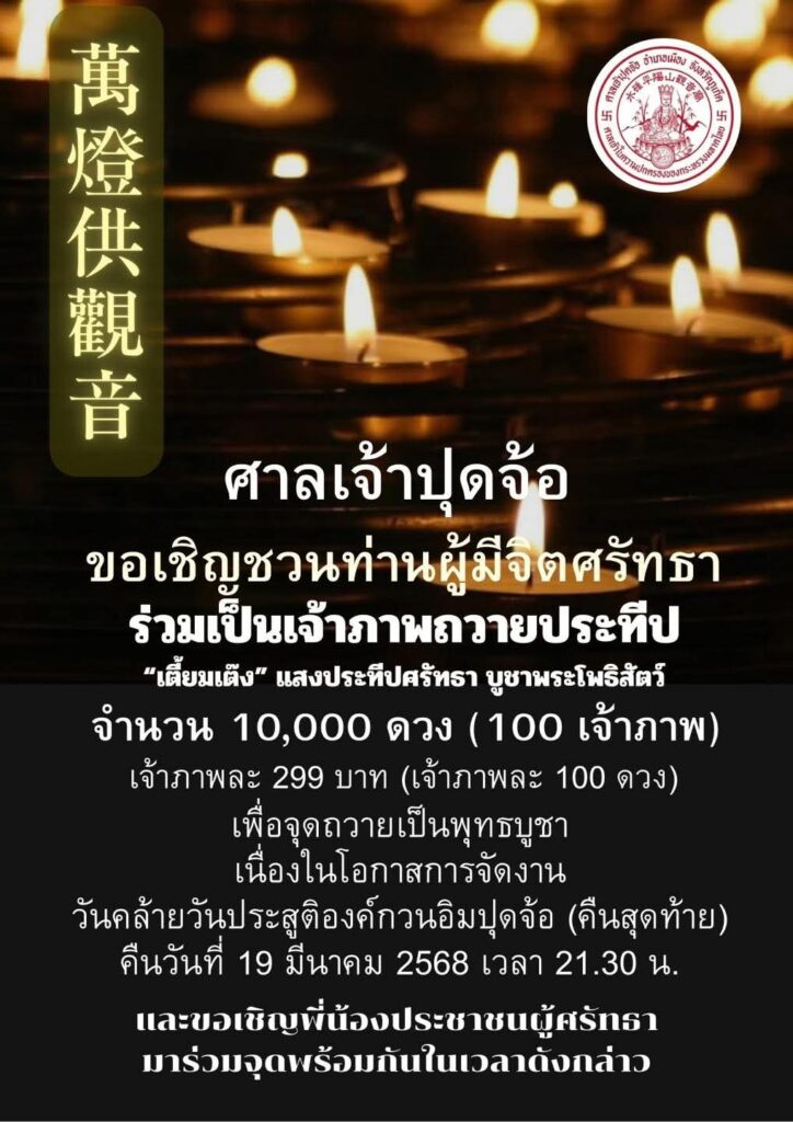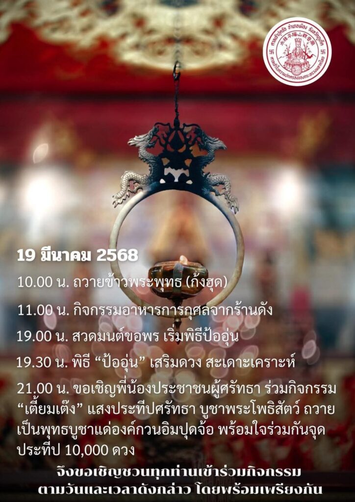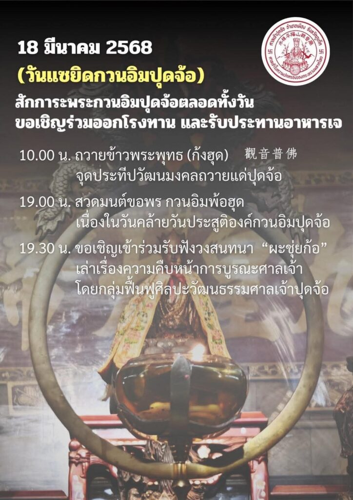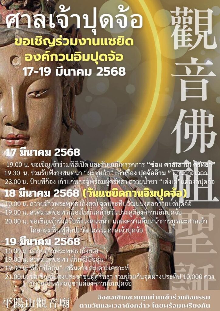 จึงขอเรียนเชิญผู้ศรัทธาทุกท่าน ร่วมสักการะบูชาองค์พระกวนอิมปุดจ้อ ตลอดทั้งวัน ร่วมออกโรงทานอาหารเจ วันเจี่ยยิด วันที่ 18 มีนาคม 2568 และร่วมในพิธีกรรมป้ออุ่น สะเดาะเคราะห์ เสริมดวงชะตา และร่วมกิจกรรมวิชาการต่างๆ ในช่วงการจัดงาน