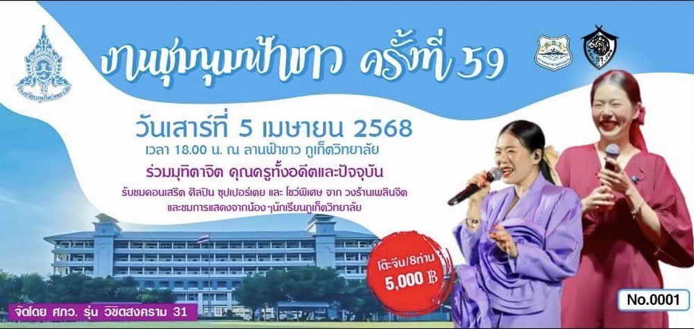 โดยสมาคมนักเรียนเก่าภูเก็ตวิทยาลัย และศิษย์เก่าภูเก็ตวิทยาลัย รุ่นวิชิตสงคราม 31 และ 34 ขอเชิญชวนศิษย์เก่าทุกรุ่น เข้าร่วมงานชุมนุมฟ้าขาวครั้งที่ 59 ในวันเสาร์ที่ 5 เมษายน 2568 นี้ ตั้งแต่เวลา 18.00 น. เป็นต้นไป ณ ลานฟ้า-ขาว โรงเรียนภูเก็ตวิทยาลัย
