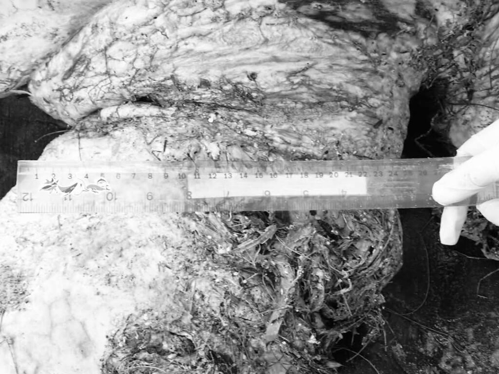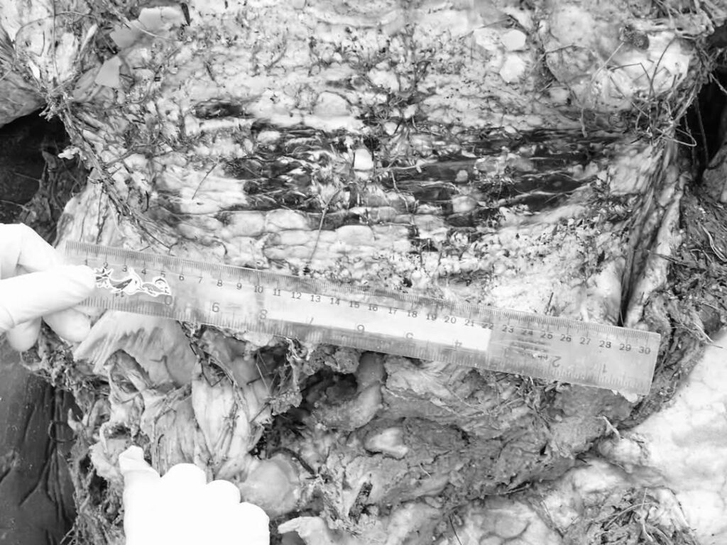 ภายในพบไขมันรอบบริเวณช่องท้อง ส่วนของอวัยวะภายใน ได้แก่ส่วนของทางเดินอาหาร ตับ ปอดหายไปเนื่องจากซากเน่ามาก โดยพบส่วนของหลอดลมมีลักษณะแดง และพบส่วนของรังไข่บางส่วน ด้วยสภาพซากที่เน่ามากทำให้ไม่สามารถระบุสาเหตุการตายได้แน่ชัด โดยเจ้าหน้าที่ ศวอบ. ได้ทำการเก็บตัวอย่างเพื่อส่งตรวจพิสูจน์ทางวิทยาศาสตร์และทำการศึกษาด้านพันธุกรรมต่อไป
