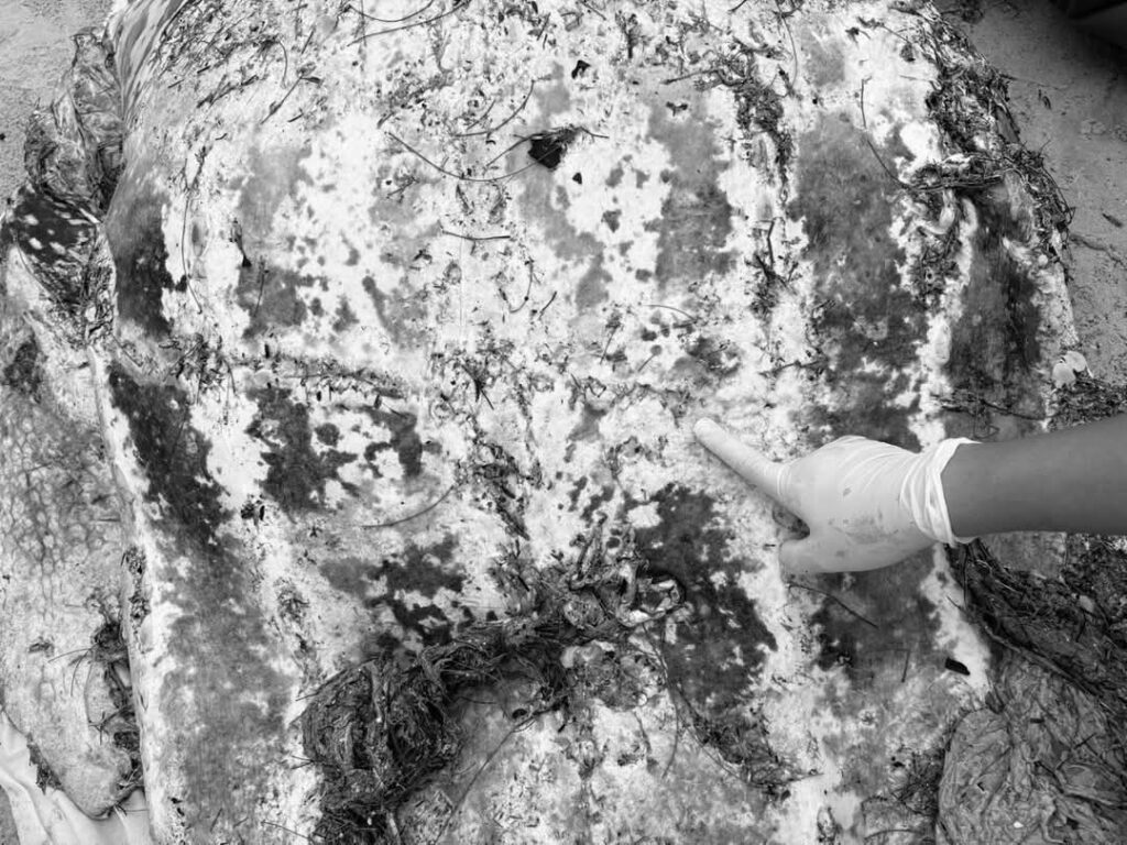 และจากการทำการผ่าชันสูตรเพื่อหาสาเหตุการตาย พบเป็นเต่ามะเฟือง (Leatherback turtle, Dermochelys coriacea) เพศเมีย โตเต็มวัย สภาพซากเน่ามาก ขนาดกระดองกว้าง 130 เซนติเมตร กระดองยาว 160 เซนติเมตร น้ำหนักประมาณ 200 กิโลกรัม