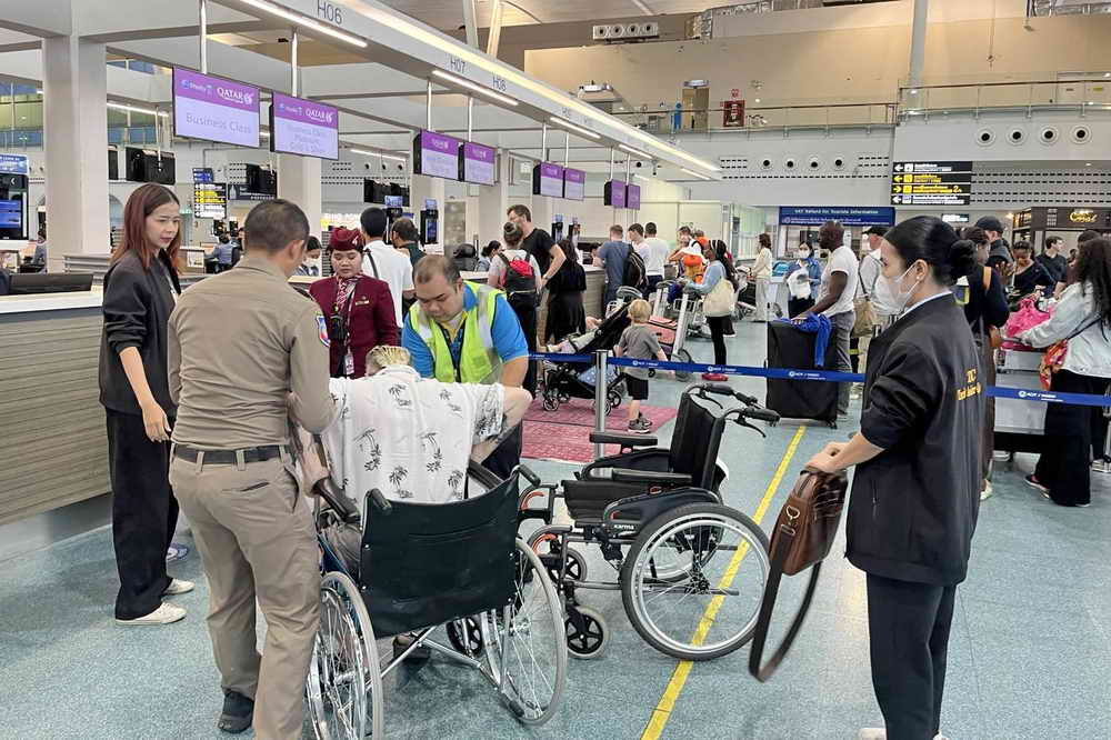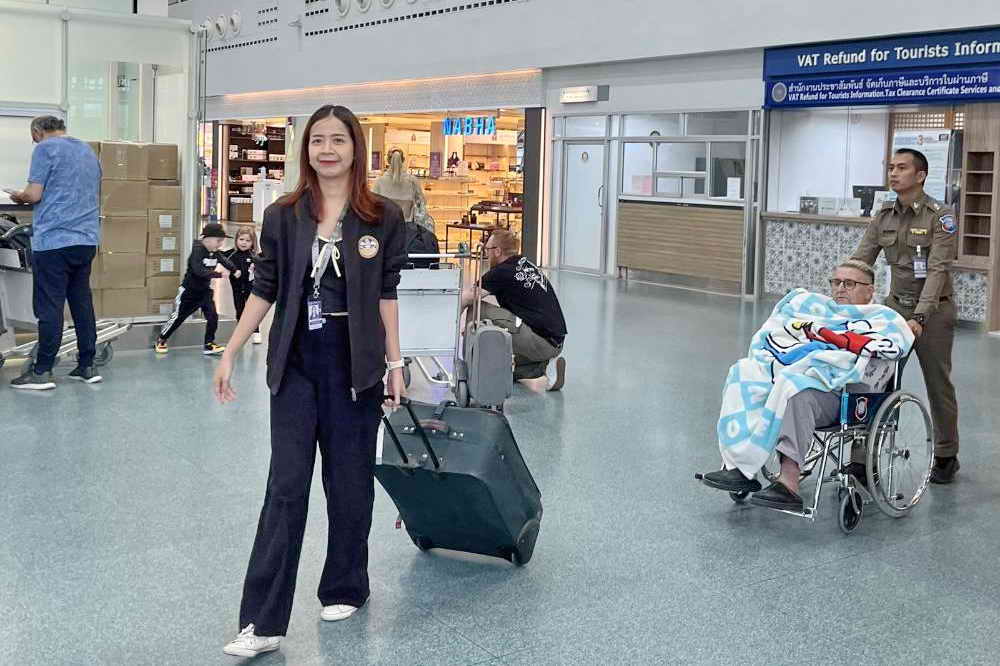 เจ้าหน้าที่ตำรวจท่องเที่ยวภูเก็ตประจำสนามบินภูเก็ต พร้อมด้วยเจ้าหน้าที่ช่วยเหลือนักท่องเที่ยว(TAC) สำนักงานท่องเที่ยวและกีฬาจังหวัดภูเก็ต ได้ช่วยกันเข็นนักท่องเที่ยวชาวต่างชาติที่เจ็บเท้า และสัมภาระ เข้าเช็คอินภายในสนามบินภูเก็ต เพื่อเดินทางกลับประเทศต่อไป