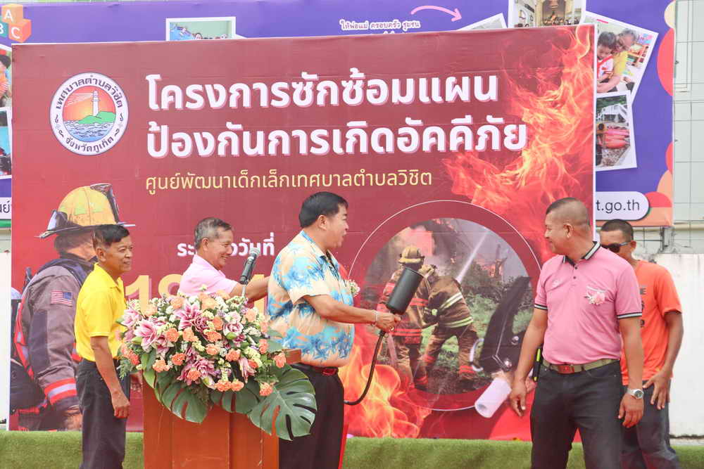 เมื่อวันที่ 19 สิงหาคม 2568 ที่บริเวณลานด้านหน้าศูนย์พัฒนาเด็กเล็กเทศบาลตำบลวิชิต ศูนย์ 1 เทศบาลตำบลวิชิต อ.เมือง ภูเก็ต นายกรีฑา โชติวิชญ์พิพัฒน์ นายกเทศมนตรีตำบลวิชิต เป็นประธานในพิธีเปิดและผู้บัญชาการเหตุการณ์โครงการซักซ้อมแผนป้องกันการเกิดอัคคีภัยศูนย์พัฒนาเด็กเล็กเทศบาลตำบลวิชิต ประจำปีงบประมาณ พ.ศ.2568