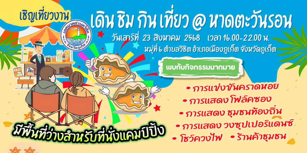 ด้วยในวันที่ 23 สิงหาคม 2568 เทศบาลตำบลวิชิต จะจัดกิจกรรม “เดิน ชิม กิน เที่ยว @ หาดตะวันรอน” ตั้งแต่เวลา 16.00 น. เป็นต้นไป ณ บริเวณหาดตะวันรอน บ้านบ่อแร่ หมู่ที่ 6 ตำบลวิชิต