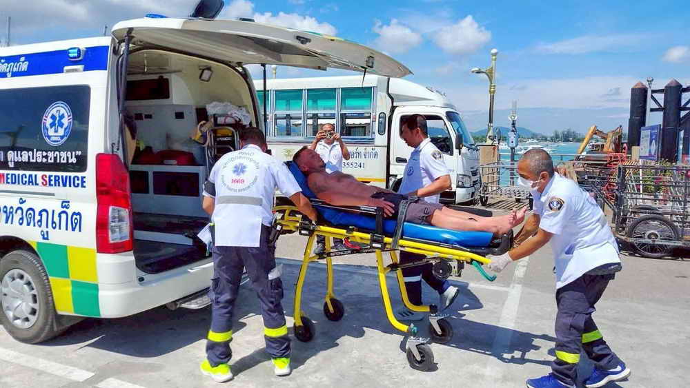 เรือกู้ชีพได้เทียบเข้าที่ ท่าเทียบเรืออ่าวฉลอง ก่อนส่งต่อให้รถพยาบาล ไข่มุก 2 นำผู้ป่วยส่งโรงพยาบาลมิชชั่น ตามความประสงค์ของผู้ป่วย เพื่อเข้ารับการรักษาอย่างเร่งด่วน