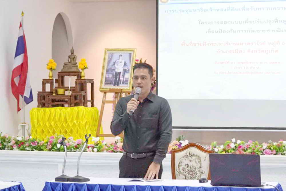ร่วมประชุมหารือกับเจ้าของที่ดินเพื่อรับทราบความต้องการโครงการออกแบบเพื่อปรับปรุงฟื้นฟูบูรณะเขื่อนป้องกันการกัดเซาะชายฝั่งทะเล บริเวณหาดราไวย์ หมู่ 6 ตำบลราไวย์