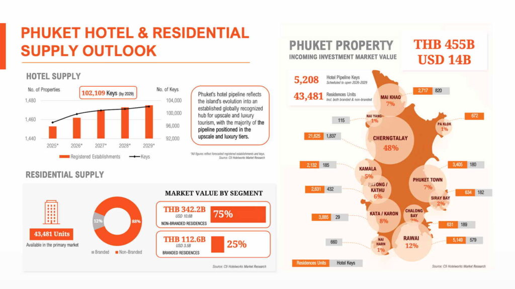 ในด้านอสังหาริมทรัพย์ ปัจจุบันมีที่อยู่อาศัยตลาด primary 43,481 ยูนิต และจะมีโรงแรมใหม่อีก 5,208 ห้อง เปิดตั้งแต่ปี 2569–2572 ทำให้จำนวนห้องพักรวมเพิ่มเป็น 102,109 ห้องภายใน 4 ปี สะท้อนให้เห็นว่า ภูเก็ต กำลังก้าวขึ้นเป็นจุดหมายปลายทางด้านไลฟ์สไตล์ระดับลักชูรีและการลงทุนที่โดดเด่นของเอเชีย