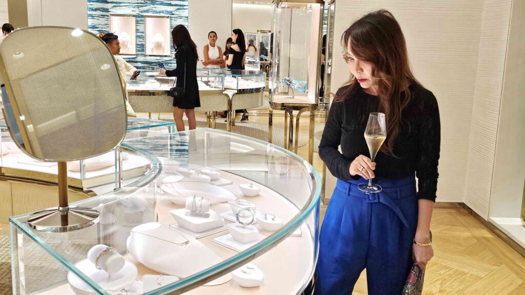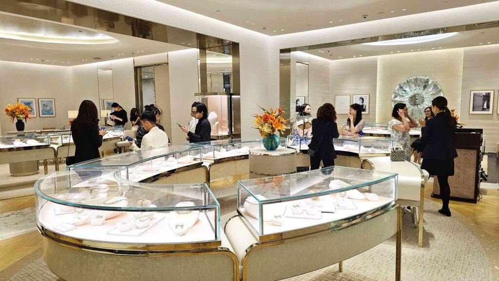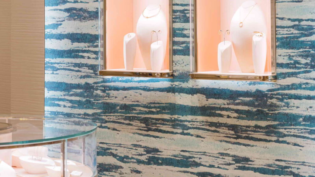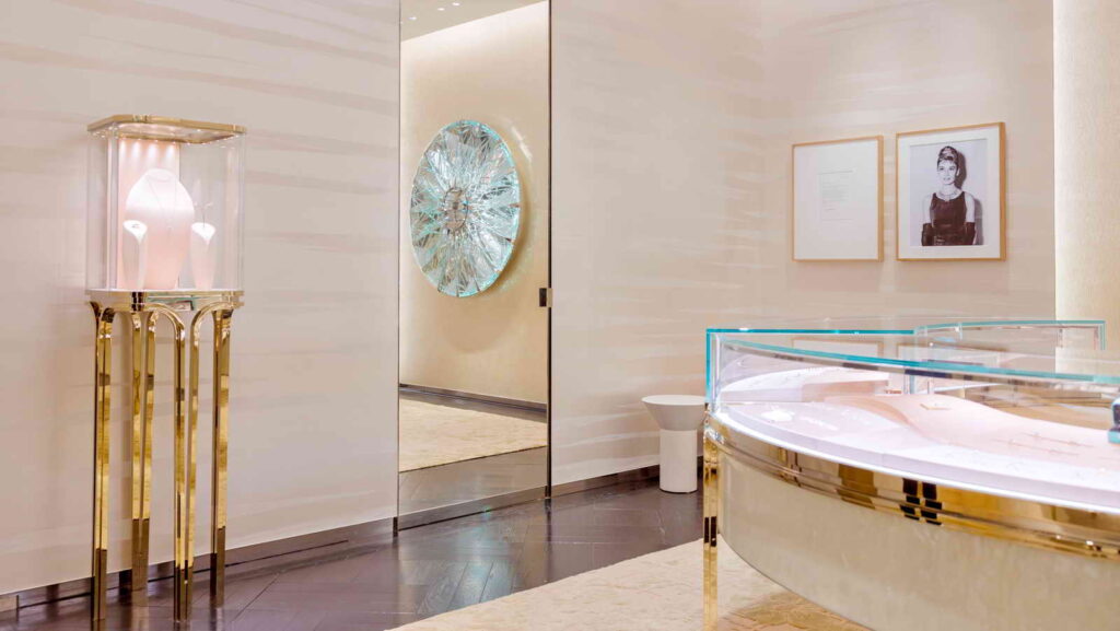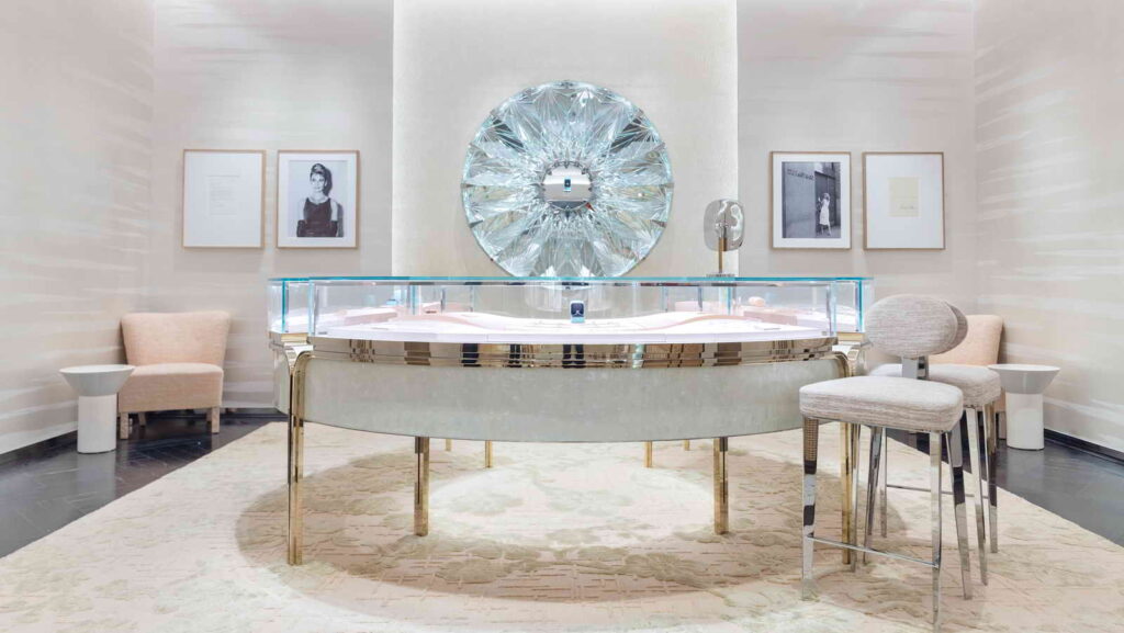 นอกจากนี้ ภายในร้านยังมีซาลอนส่วนตัว ที่ตกแต่งด้วยวอลเปเปอร์ลายกล้วยไม้ สื่อถึงความผูกพันของ Tiffany & Co. กับธรรมชาติ ใจกลางห้องประดับด้วยโต๊ะงานฝีมือแทรกคริสตัลสีขาวอย่างละเอียดอ่อนพร้อมโครงโลหะสีแชมเปญ สะท้อนการผสานระหว่างศิลปะและความหรูหราได้อย่างลงตัว เพื่อมอบประสบการณ์การเลือกซื้ออย่างเป็นส่วนตัวและใกล้ชิดแก่ลูกค้า