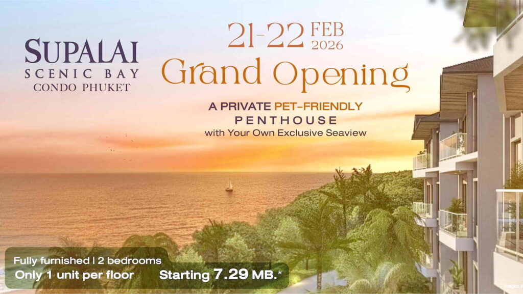 ทั้งนี้ บริษัท ศุภาลัย จำกัด (มหาชน) เดินหน้าขยายพอร์ตอสังหาริมทรัพย์ในเมืองท่องเที่ยว เปิดตัวโครงการใหม่ระดับพรีเมียม “ศุภาลัย ซีนิค เบย์ คอนโด” (Supalai Scenic Bay Condo) คอนโดมิเนียมสไตล์ วิลล่าติดทะเล ที่โดดเด่นด้วยความเป็นส่วนตัวสูง เพียง 18 ยูนิต ทุกห้องเปิดรับวิวทะเลอ่าวปอแบบพาโนรามา มอบประสบการณ์การอยู่อาศัยเสมือนรีสอร์ตส่วนตัว ใกล้ชายหาดเพียง 200 เมตร ในราคาเริ่มต้น 7.29 ล้านบาท* เปิดให้สัมผัสบรรยากาศจริงในงาน Grand Opening วันที่ 21-22 กุมภาพันธ์ 2569 พร้อมข้อเสนอและสิทธิพิเศษเฉพาะภายในงาน