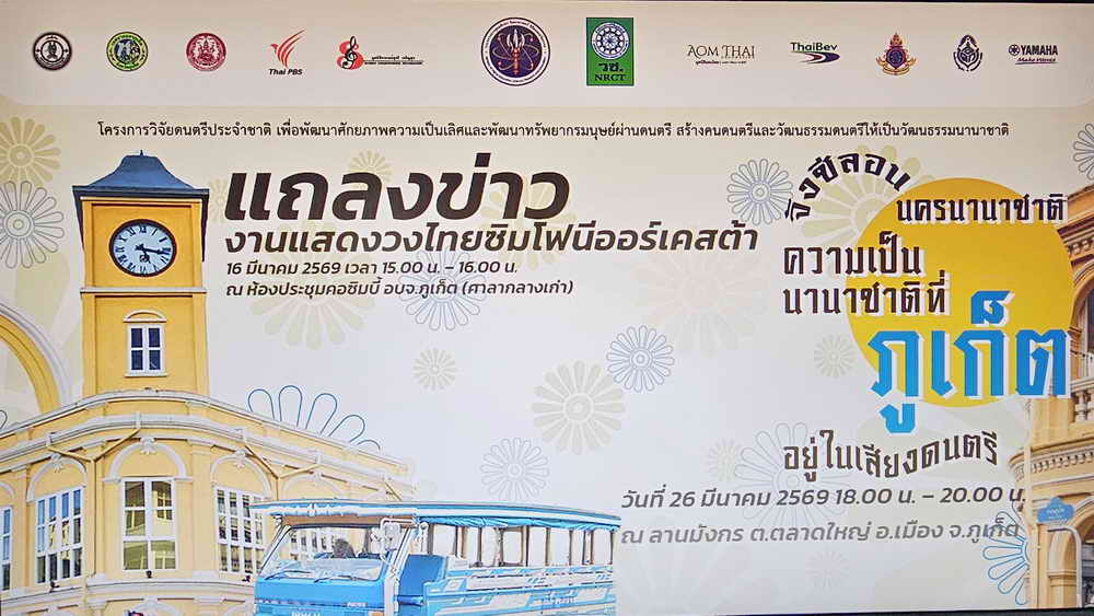 เมื่อวันที่ 16 มีนาคม 2569 ที่ห้องประชุมคอซิมบี้ องค์การบริหารส่วนจังหวัดภูเก็ต (อบจ.ภูเก็ต) มูลนิธิอาจารย์สุกรี เจริญสุข จัดแถลงข่าวการแสดงดนตรี วงไทยซิมโฟนีออร์เคสตรา “จังซีลอน นครนานาชาติ ความเป็นนานาชาติที่ภูเก็ตอยู่ในเสียงดนตรี” ภายใต้โครงการวิจัยดนตรีประจำชาติเพื่อพัฒนาศักยภาพความเป็นเลิศและพัฒนาทรัพยากรมนุษย์ผ่านดนตรี