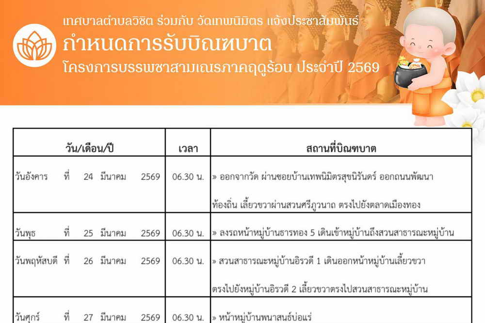 เมื่อวันที่ 24 มีนาคม 2569 ที่บริเวณหมู่บ้านเทพนิมิต สุขนิรันดร์, ถนนพัฒนาท้องถิ่น, สวนศรีภูวนาถ และตลาดเมืองทอง หมู่ 1 ตำบลวิชิต อำเภอเมืองภูเก็ต จังหวัดภูเก็ต พระสงฆ์วัดเทพนิมิตร พร้อมสามเณรในโครงการบรรพชาสามเณรภาคฤดูร้อน ประจำปี 2569 ออกรับบิณฑบาต